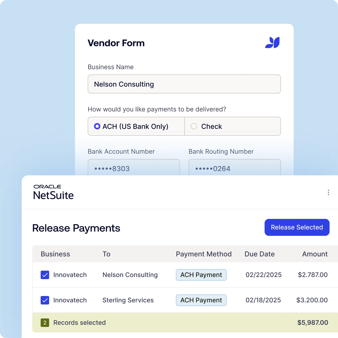 Release payments directly from NetSuite with zero manual file handling. While other solutions make you download NACHA files and upload them to banking portals, we handle the complexity behind the scenes. Create end-to-end payments, without the back-and-forth.