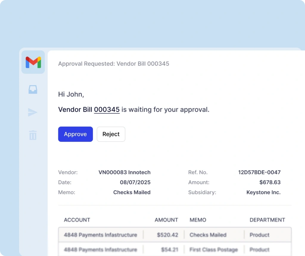 Route payments through sophisticated approval workflows where stakeholders can approve directly from email—no NetSuite license required. Stop forcing approval bottlenecks just to minimize licensing costs.