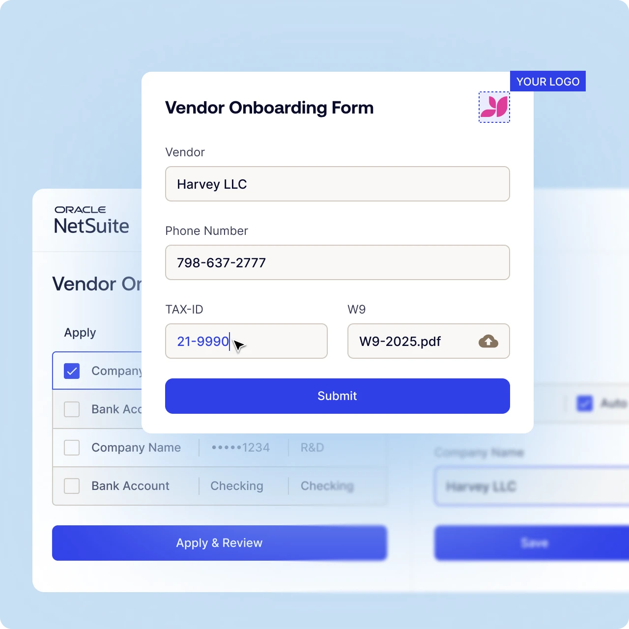 Implement comprehensive vendor onboarding with zero maintenance burden. Built natively within NetSuite, the solution requires no integrations, no external systems, and no performance impact. Leverage existing NetSuite security, backup, and upgrade processes while delivering powerful automation capabilities.