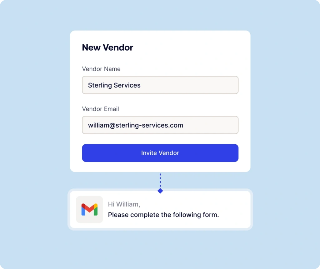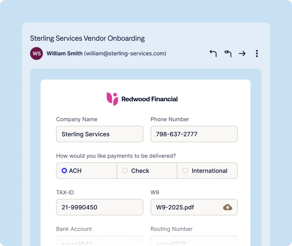 Automated vendor onboarding that eliminates setup delays. Streamline vendor setup with custom forms via Advanced Vendor Onboarding and secure your vendor payment information with Vendor Payment Onboarding. No portals, no passwords, no integrations. Just smart automation that turns vendor setup from weeks-long back-and-forth into streamlined workflows that scale with your business.