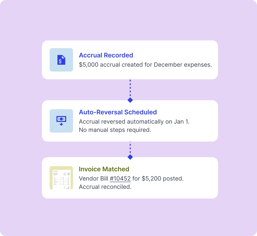 Automatically reverses accrual entries when actual invoices are processed to prevent double-counting, eliminating manual reconciliation work while maintaining accurate financial statements and complete audit trails throughout the process.