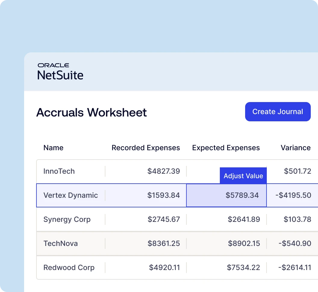 Yes, the system presents all potential accruals in a consolidated worksheet where you can review, confirm, and make real-time adjustments to estimates before creating journal entries. Accrual Automation gives you complete control over the final amounts