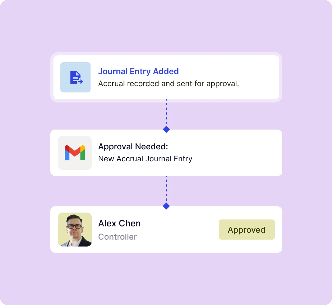 Streamlines accrual journal entry creation with one-click generation and automatic routing through your existing approval matrix, allowing approvers to review and approve entries via email without requiring NetSuite licenses while maintaining complete audit trails.