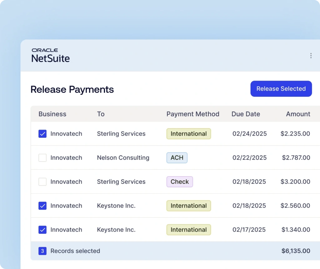 Review domestic and international vendor bills from the same NetSuite interface. No toggling between systems to see what needs paying. The system shows each vendor’s configured payment method and currency automatically—whether it’s US ACH, IACH, international wire, or check payments, they’re all in one unified queue.