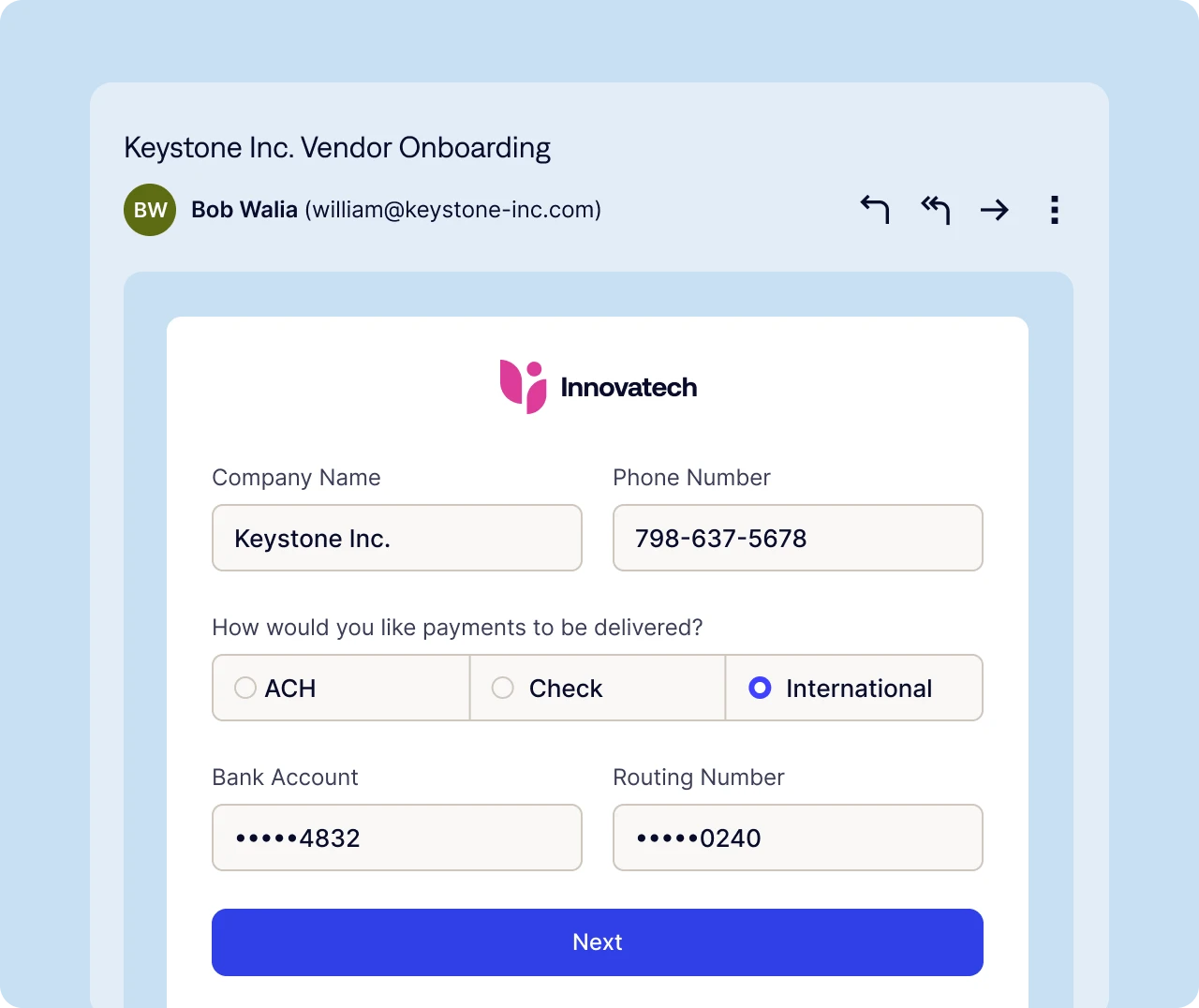 Vendors directly enter their banking details through secure forms. Charted immediately captures and encrypts all sensitive payment data within our SOC2-compliant platform, ensuring bank-level security while maintaining appropriate user access controls. This approach delivers a seamless user experience with enterprise-grade security.