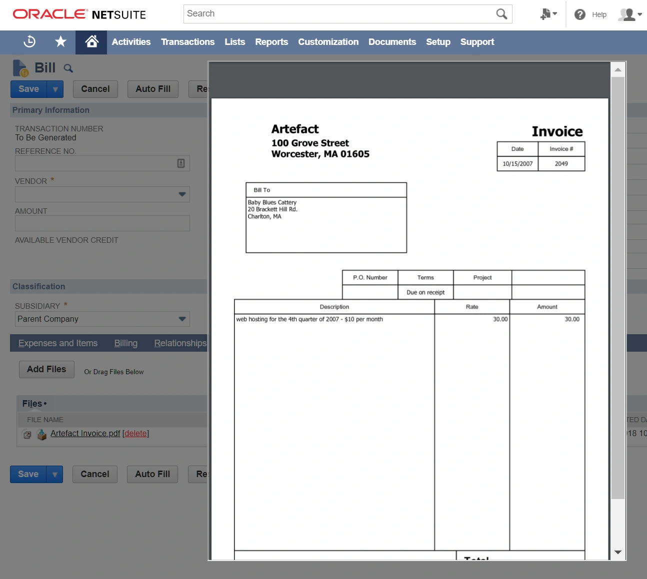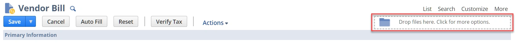 In order to reduce the number of clicks, NetSuite developed a “Drag and Drop” Bundle that’s available free of charge. Users can install this bundle and NetSuite will add a small region at the top of the supported transactions where users will be able to drag and drop any document and NetSuite will add it to the “Files” tab automatically. This is definitely a usability improvement, but it feels like a band-aid, more than a cohesive solution that addresses all usability problems. The screenshot below shows the “Drag and Drop” region in a Vendor Bill record: