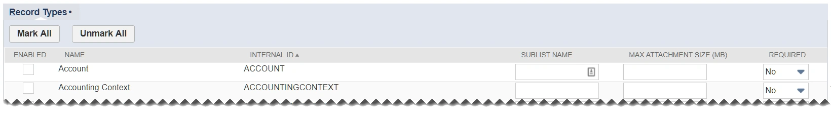 - Ease of Use – When using Advanced Attachments, a new tab gets created on those records that you select. The screenshot below shows how to setup a new record to use the Bundle. Simply check the “Enabled” checkbox, select the name you want for the tab, if you want to limit the size of the attachments and if you want to require an attachment every time a new record is created: