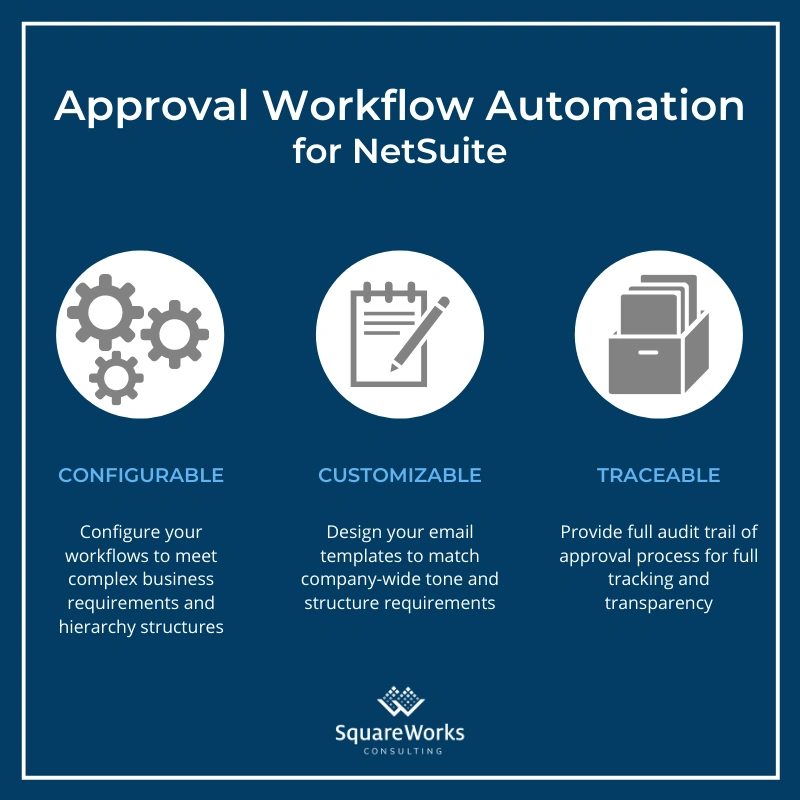 By following a configured workflow and hierarchy structure, the approval requests are automatically routed through your organization to the appropriate person. This process includes the delivery of an Email requesting the next approver to confirm or deny the request. These requests can be approved or denied in NetSuite or in your email inbox directly by clicking on the hyperlinks located in the Email.