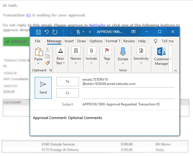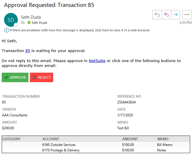 - No need for a NetSuite Login: Remove the need to sign into NetSuite when a request comes in – streamline your business’ processes by approving or rejecting all record types without leaving your email inbox. Limit NetSuite access to those who need it, and enable your team to do more with their everyday tools.