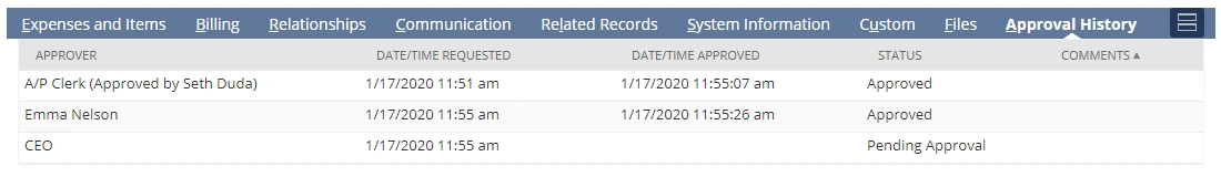 - Upon sending the auto-generated approval email, the Approval Workflow Automation Bundle will update the status of the request in your NetSuite transaction to “Approved,” as well as list any comments included: