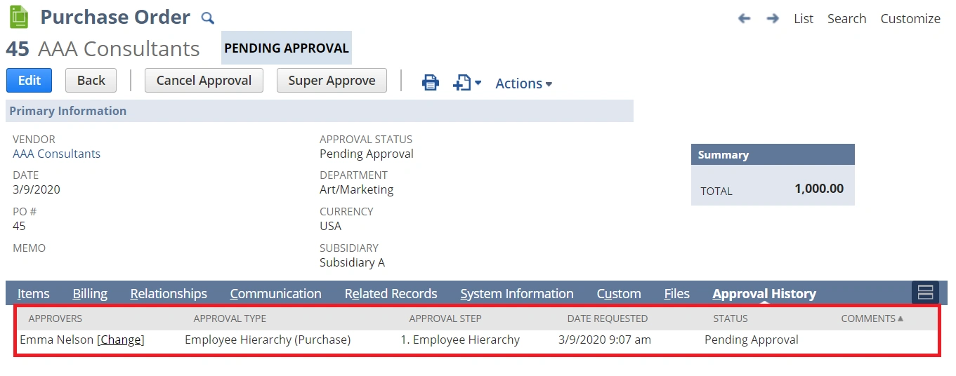 In NetSuite, there’s also the concept of a Purchase Approver. Similar to a Supervisor, they are specified on an Employee’s record. If a Purchase Approver is specified, the Purchase Approver should be used for approval instead of the Supervisor.
