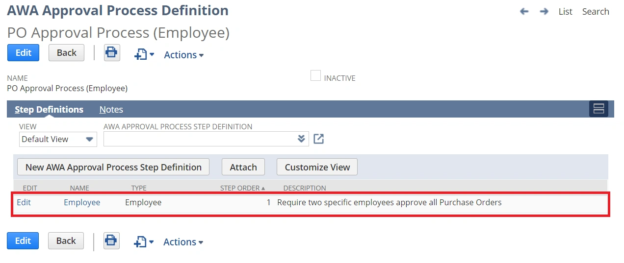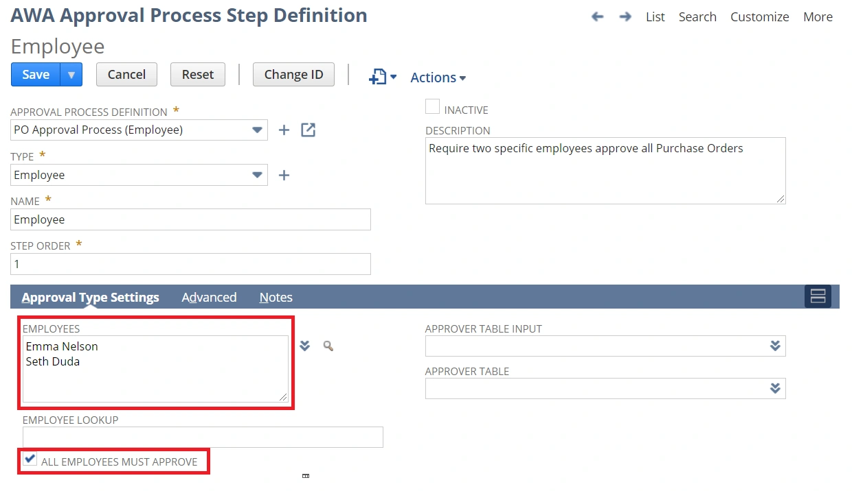 Step 3: Configure the Approval Step to specify the required employees and indicate that all of the specified employees must approve