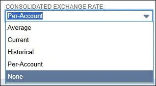 None – No Consolidated Exchange Rates will be applied. Amounts will be displayed in the Base Currency of the Transaction Subsidiary.