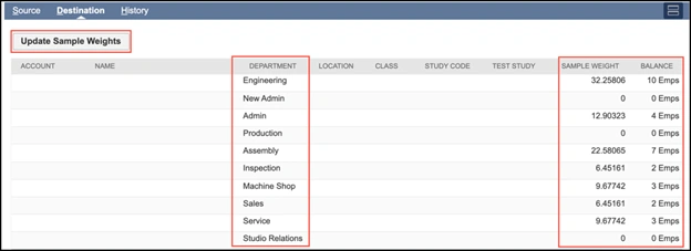 For our destination tab, we’ve created a line for each department. Unlike Fixed Schedules, we don’t define the weighted amounts directly on the Allocation Schedule. Instead, this is done using statistical accounts in NetSuite. Statistical accounts can be updated either by a manual Statistical Journal Entry, or a statistical schedule can be created to use saved searches to auto-update balances. Click the Update Sample Weights button while in edit mode to see the Sample Weight (displayed as a percentage) and the Balance (the total number of employees in each department).