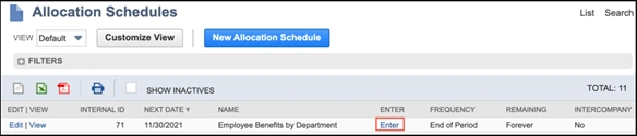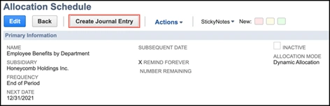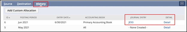Review the History tab on the Allocation Schedule to review a list of all allocation journals generated from this schedule, with links to the transactions and detail.