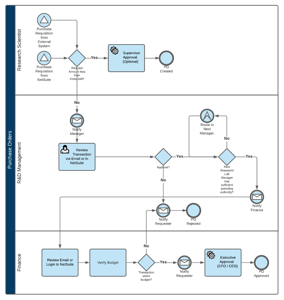 For example, below is a conceptual flowchart of a commonly used Purchase Order approval flow for Biotech that Charted delivers as part of an implementation. This process can incorporate requisitions initiated in NetSuite or coming from external systems or sources.