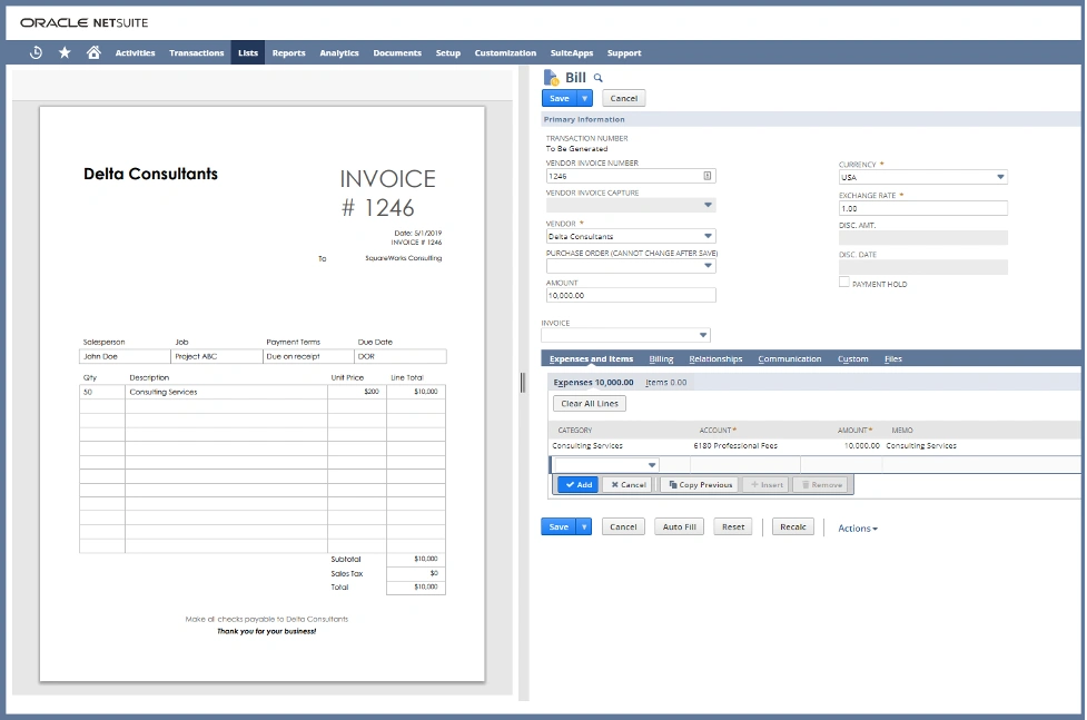 Once PO’s have been approved and issued, the Accounts Payable process comes in. When adding Charted AP Automation Suite, AI-Enabled OCR & Invoice Scanning solution for NetSuite, companies benefit from a number of features to better manage the invoice intake process. For example, below is a screenshot of the side-by-side view of the vendor invoice and the information captured in NetSuite, which is a proprietary feature from Charted. Invoices can be emailed into NetSuite or dragged-and-dropped into the screen for processing. The finance team will be able to streamline the process to easily get invoices paid.