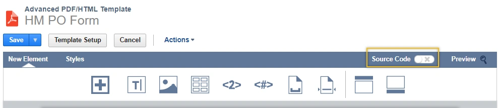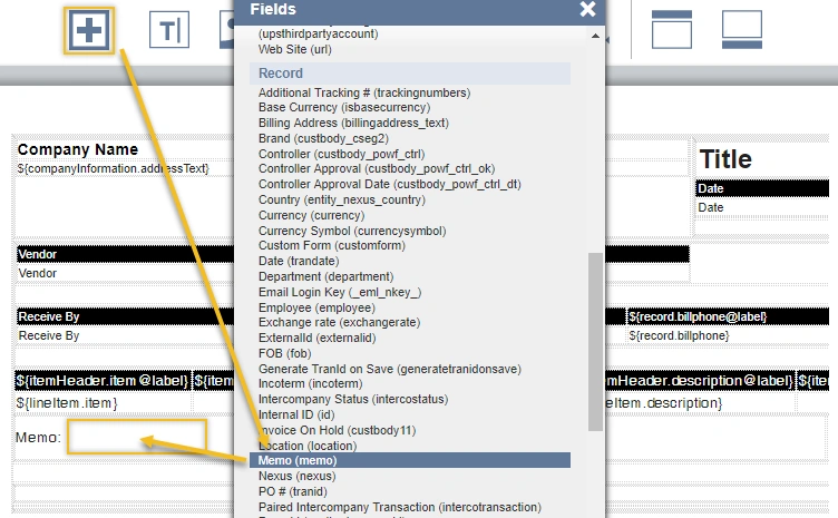 Let’s say we’re working on an Advanced PDF/HTML Template and want to dynamically pull in fields from the Purchase Order. After pulling up the template, it’s fairly straightforward to add the basic fields from the PO to the template using the ‘Add Fields’ button.