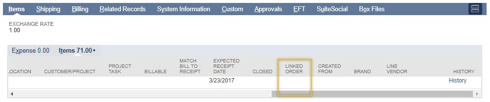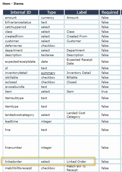 But adding information from the Item Sublist isn’t as easy. This is where the Schema Browser comes in. We want to add in the PO number of any linked orders, which can be seen on the line item in the Items Sublist.