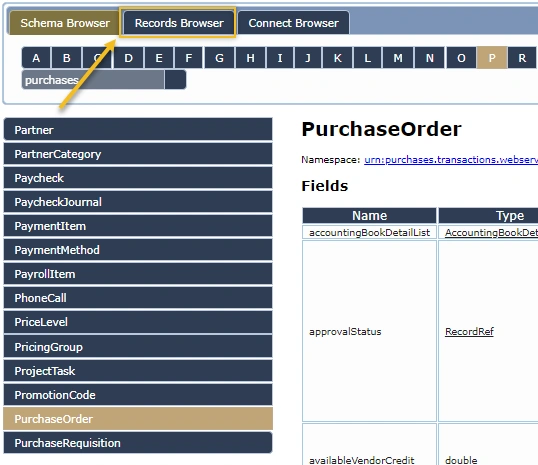 Next, open the Schema Browser and navigate to the Purchase Order page using the alphabetical list at the top of the page, then clicking on “PurchaseOrder” in the menu on the left. You’ll notice that sublists aren’t displayed on the Schema Browser, so instead click on the Records Browser tab. Scroll to the bottom of the page to find the Sublists.