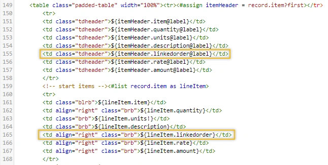 Now that we know the Internal ID, we can add that into the source code of the PO Advanced PDF/HTML Template. In the header of the table we add “@label” to the end of my Freemarker tag in order to display the field label on our form, and then reference the field in the body of the table.