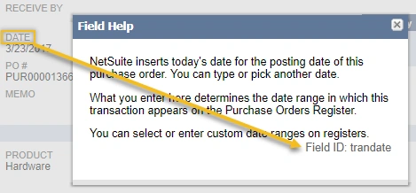 While this can’t be set to display at a company level and most folks will never user them anyway, if you work with web services or SuiteScript then you’ll be referencing many of these Internal IDs in your code. They’re also helpful when prepping CSV imports or even during screen share troubleshooting sessions! You can view the Internal ID for a field by clicking on that field’s label to open the field level help popup window.