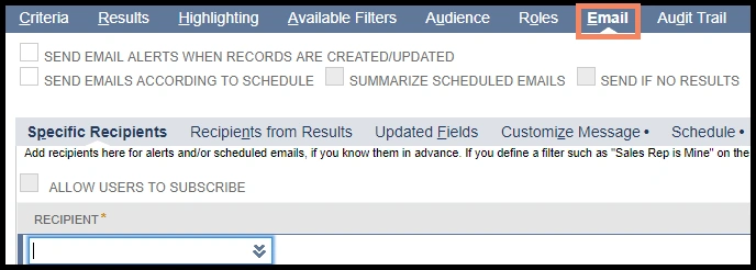 If the “Send Email Alerts When Records are Created/Updated” box is checked, NetSuite will send an email to the specified recipients whenever records matching the search criteria are created. NetSuite will also send an email when records are updated, but only if the “Send on Update” box is checked for either specific recipients or on the “Recipients from Results” subtab:
