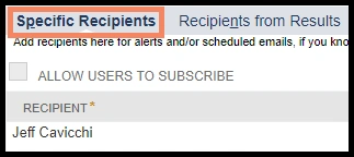 The next step is to define to whom automated emails will be sent. If you wish to always send all search results to specific recipients, those recipients are designated on the “Specific Recipients” subtab: