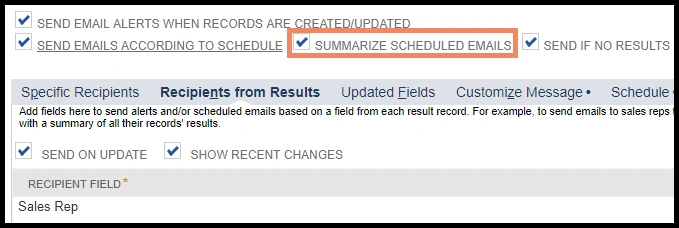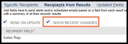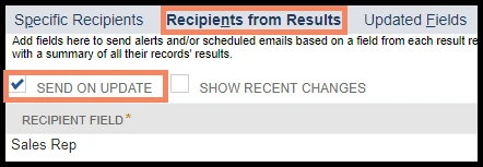 Note that the “Send On Update” and “Show Recent Changes” options are also available for “Recipients from Results.”