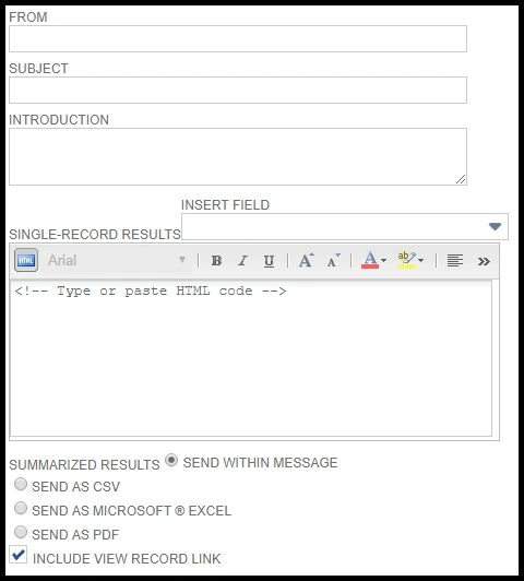 - Allows for additional formatting to be applied to single-record results. Additional search fields may be inserted via this option, as may formulas. Useful when using the “Recipients from Results” option with the “Summarize Scheduled Emails” box unchecked.