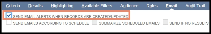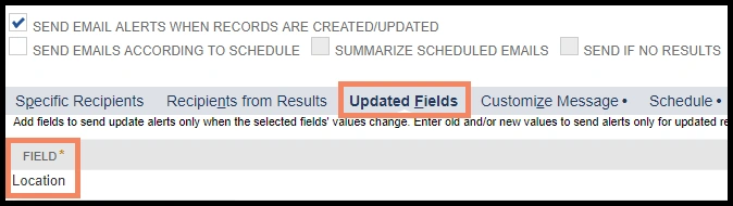 If the “Send Email Alerts When Records are Created/Updated” box is checked, and particular fields are referenced on the “Updated Fields” subtab, emails will be sent only when values for those specific fields are updated: