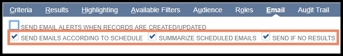 The first step when configuring automated emails is to determine when those emails are sent – when records matching the search criteria are created and/or updated, or on a set schedule. Note that you may use one or the other or both of these triggers on a single saved search depending on your needs.