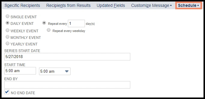 Emails may be sent once, daily, on specific days, monthly, or yearly. In addition, you may specify a start time and a start and end date. In the example above, emails will be sent every day at 5:00 am starting on 5/27/18. There is no end date to this schedule.